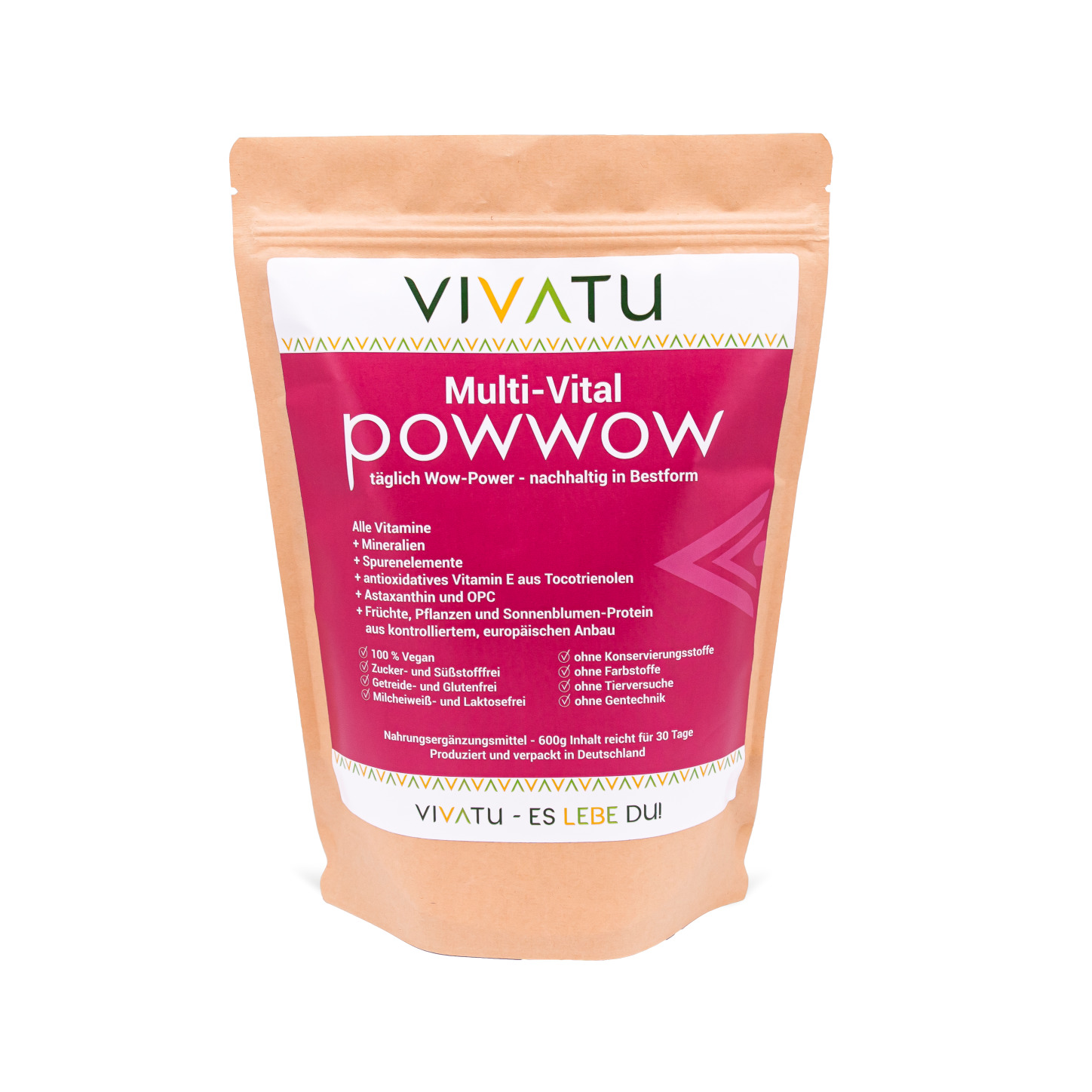 In vivatu Multi-Vital powwow vereinen sich hochwertige Vitamine, Mineralstoffe, Spurenelemente mit pflanzlichem Protein nebst Frucht- und Pflanzenpulvern. Alle Inhaltsstoffe liegen in einer deinem Körpber bekannten, bioverfügbaren Form vor. Bioverfügbar heißt, dein Körper kann alle Mikronährstoffe schnell aufnehmen und gut nutzen. Die wertvollen Pflanzenstoffe kommen allesamt aus kontrolliertem europäischen Anbau. Diese sorgen dafür, dass dein Körper alle enthaltenen Vitalstoffe noch besser aufnehmen kann. Denn Naturstoffe sind grundsätzlich ein günstiges Umfeld für die Vitalstoff-Aufnahme. Die Mischung enthält alle wichtigten Mikronährstoffe in ausgewogenem Verhältnis für den täglichen Bedarf eines gesunden Menschen. Vivatu Multi-Vital powwow lässt sich flexibel für groß und klein dosieren und schmackhaft zubereiten.